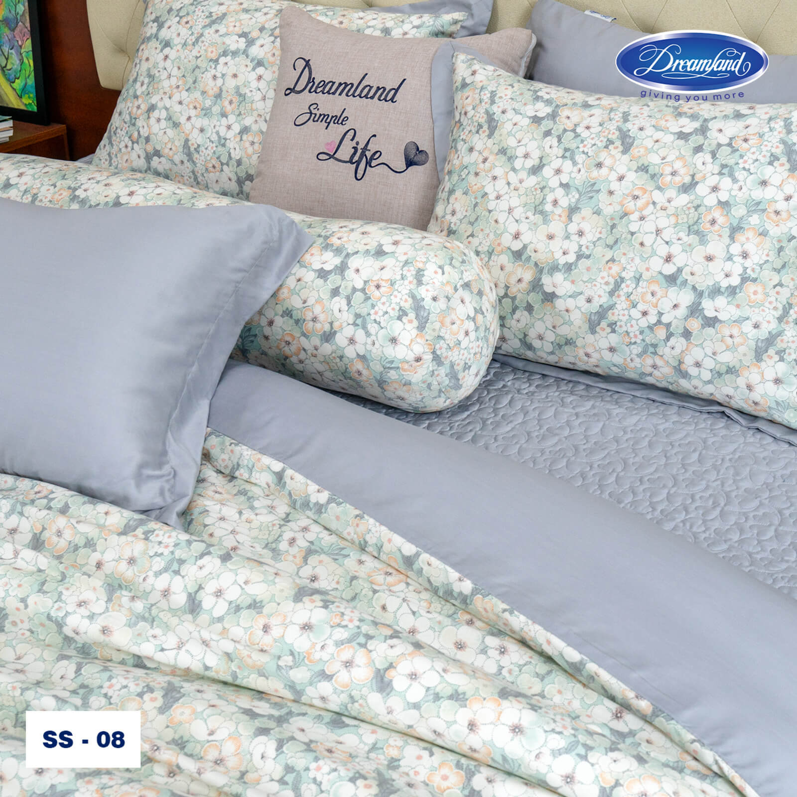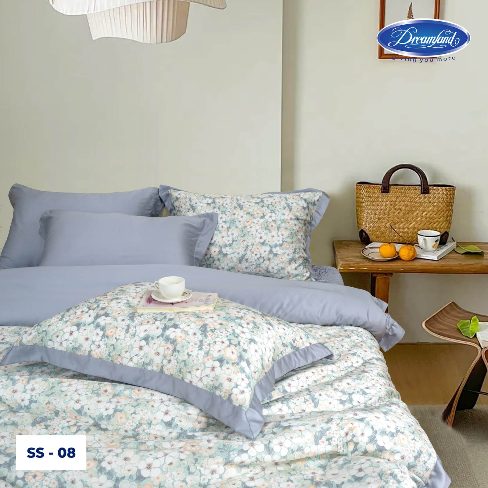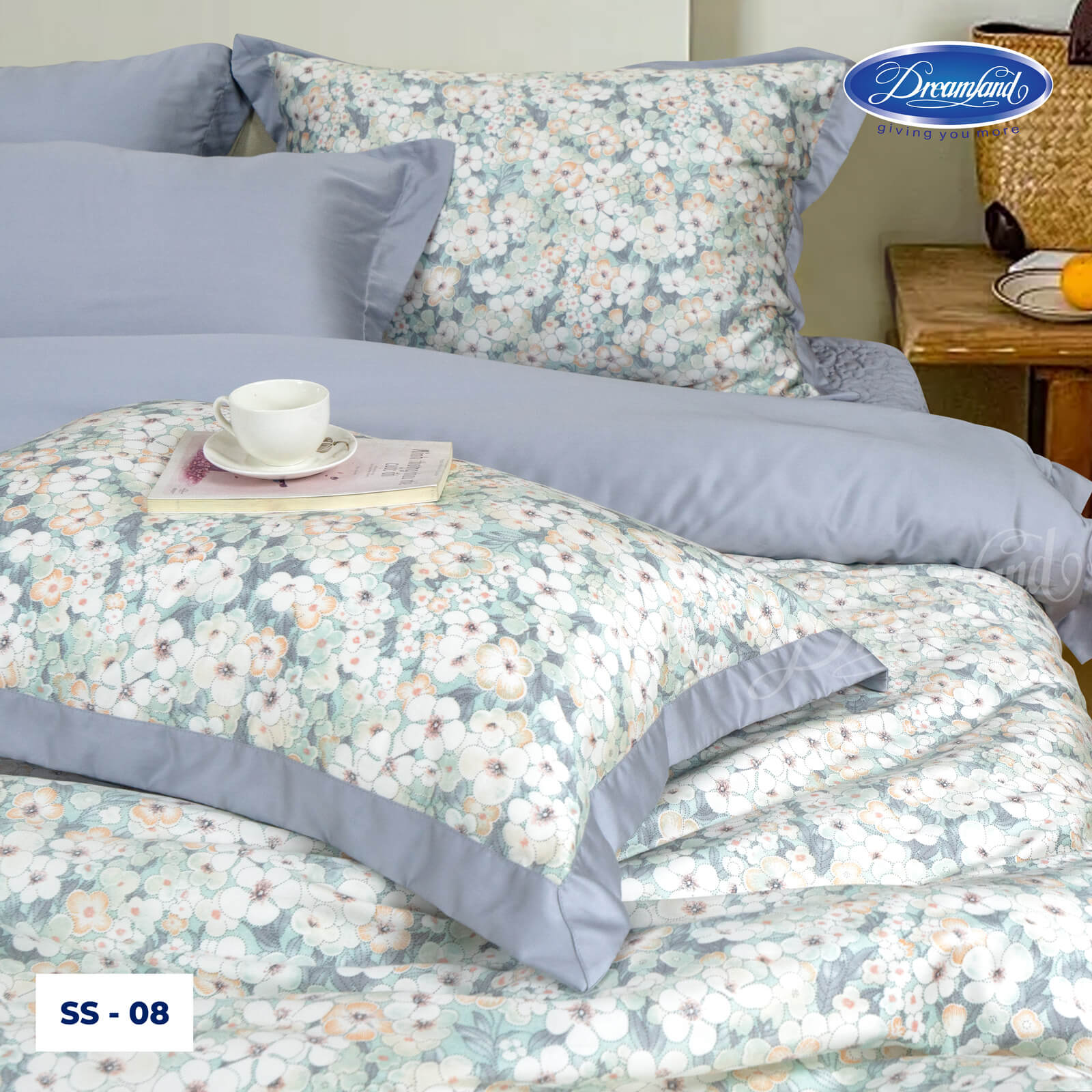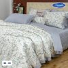 Sự kết hợp khéo léo giữa vải trơn màu xanh tro và phần hoa văn giúp tổng thể bộ sản phẩm vừa trang nhã, vừa mang nét cổ điển, dễ dàng hòa hợp với nhiều không gian nội thất. Chất liệu mềm mại, thoáng mát, từng đường may đều được chăm chút tỉ mỉ, mang đến trải nghiệm nghỉ ngơi thoải mái, êm ái và đậm chất tinh tế.
