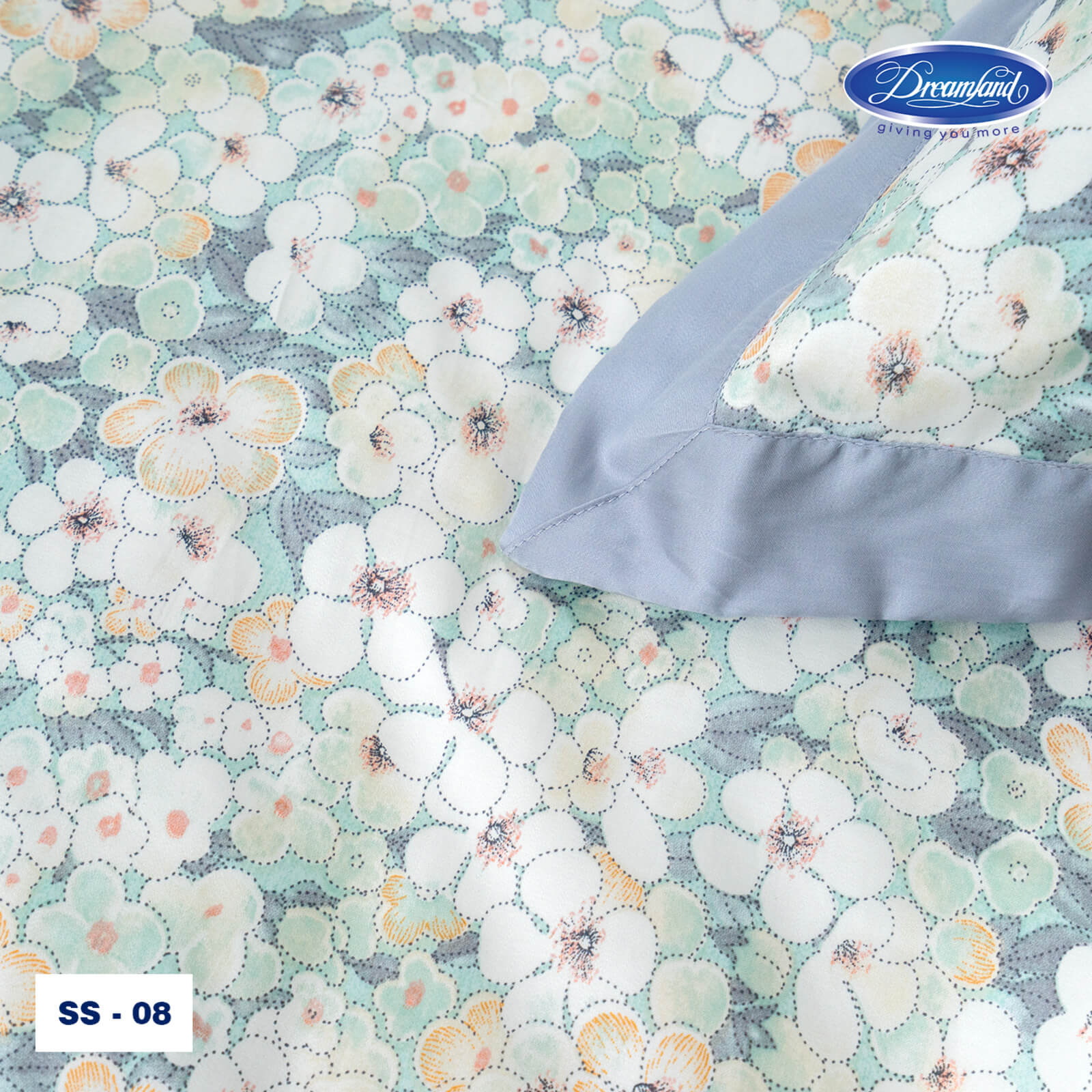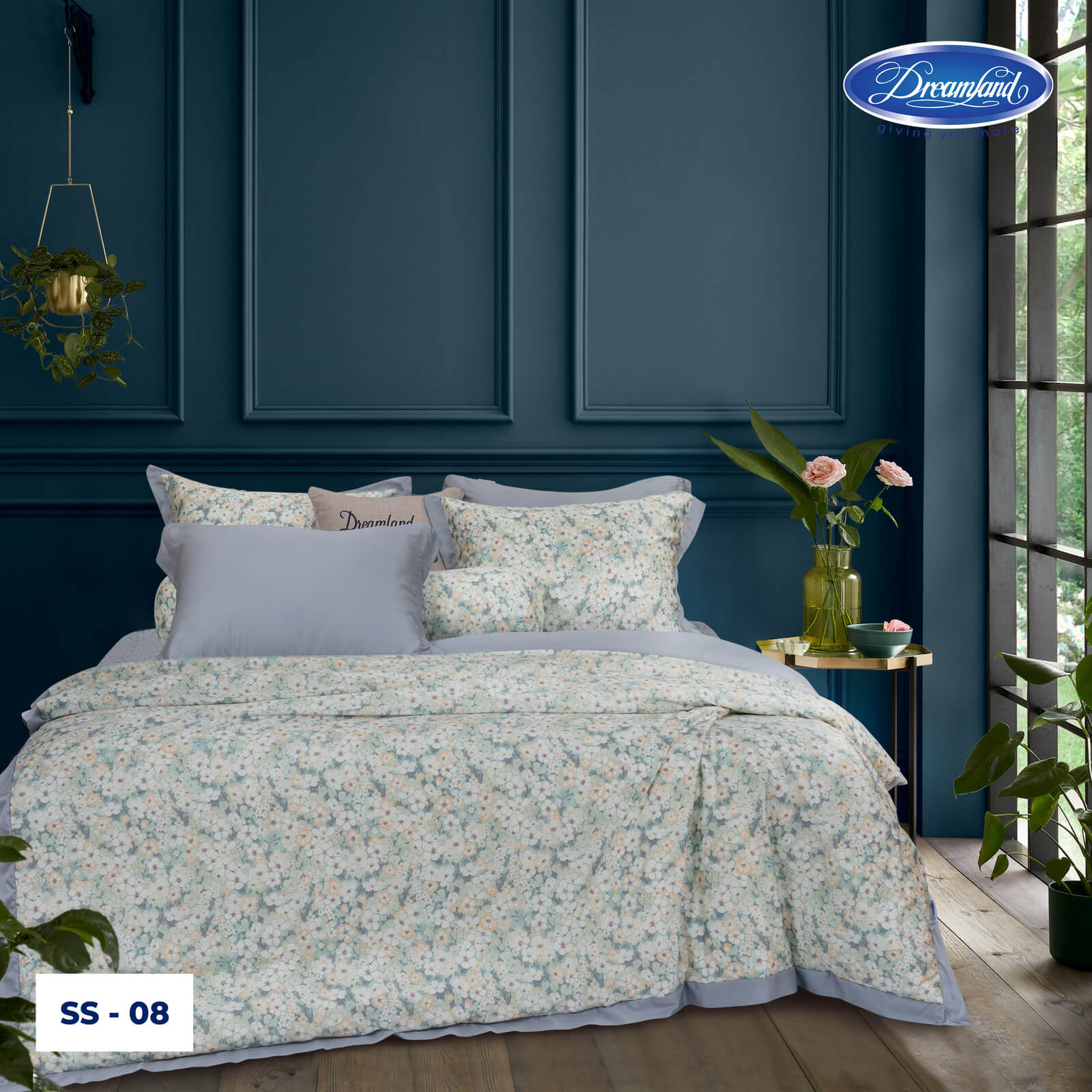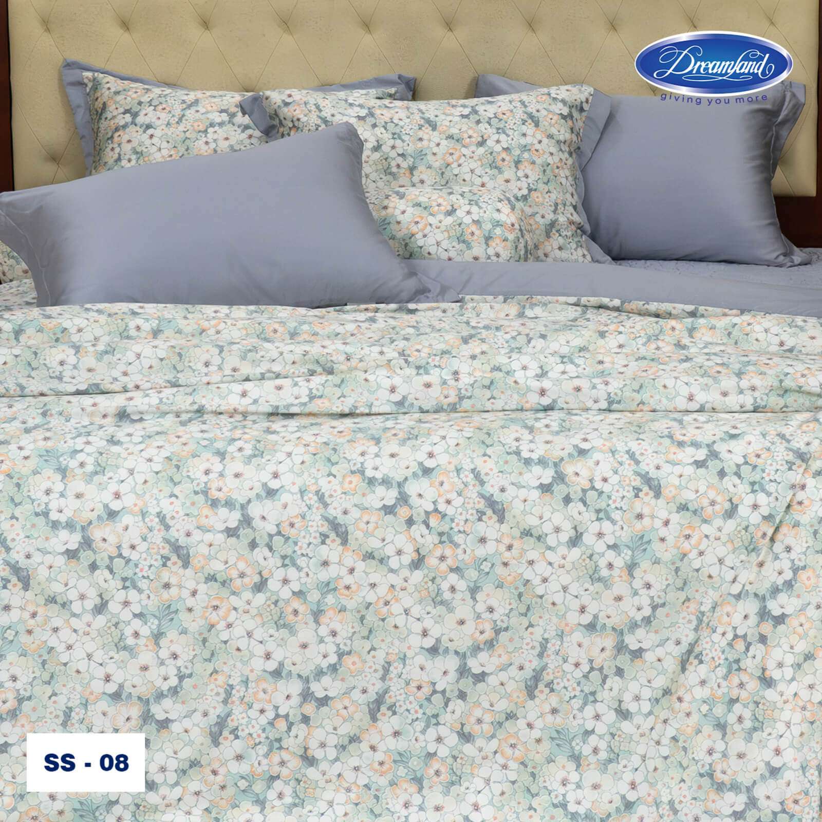 Sự kết hợp khéo léo giữa vải trơn màu xanh tro và phần hoa văn giúp tổng thể bộ sản phẩm vừa trang nhã, vừa mang nét cổ điển, dễ dàng hòa hợp với nhiều không gian nội thất. Chất liệu mềm mại, thoáng mát, từng đường may đều được chăm chút tỉ mỉ, mang đến trải nghiệm nghỉ ngơi thoải mái, êm ái và đậm chất tinh tế.